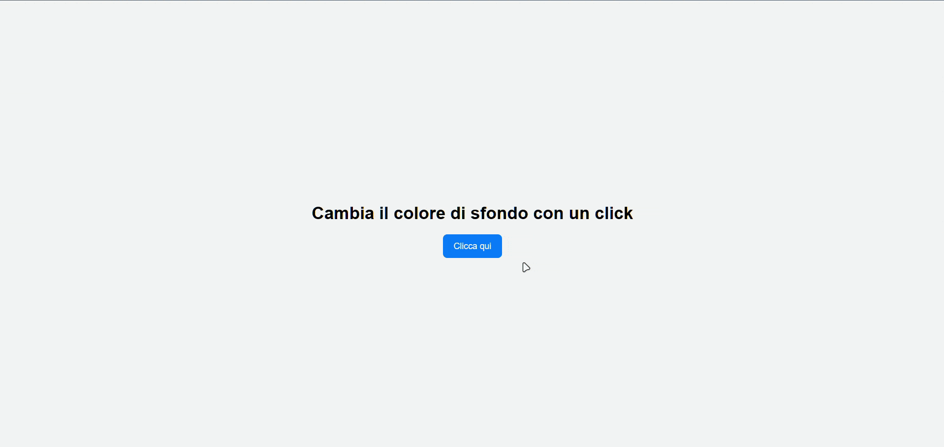 Una volta messi insieme i tre pezzi di codice – HTML, CSS e JavaScript – otteniamo una pagina semplice ma efficace. Al centro dello schermo compare un titolo che spiega l'obiettivo e, subito sotto, un pulsante ben visibile. Finché non viene premuto, la pagina mostra uno sfondo neutro impostato dal CSS. Dopo il primo click tutto prende vita: il colore di sfondo cambia in modo casuale, regalando un effetto immediato e sempre diverso.