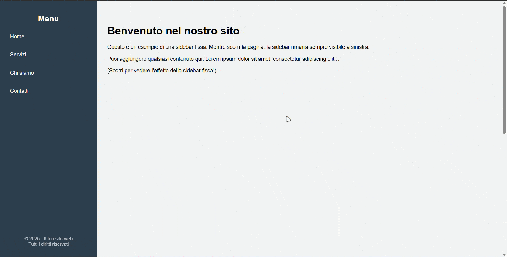 Il risultato ottenuto è una sidebar fissa funzionale e ben strutturata, che rimane visibile durante lo scroll, migliorando la navigazione e l'usabilità del sito. Grazie alla semplicità di HTML e CSS, può essere facilmente personalizzata per adattarsi a diversi progetti web: possiamo modificarne dimensioni, colori, font e animazioni, aggiungere icone, sottomenu o effetti visivi, e persino renderla dinamica con JavaScript per espandersi o ridursi a comando.