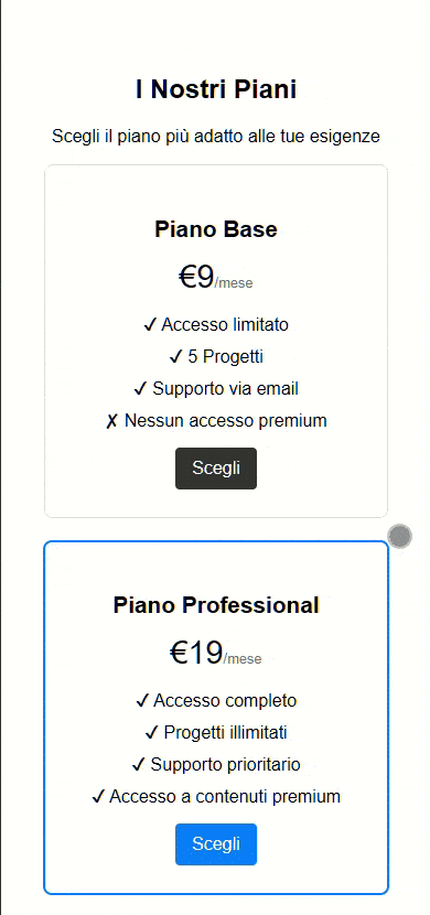 L'obiettivo è quello di ottenere un design chiaro e professionale. Il layout sarà ordinato in schede affiancate su desktop e in colonne verticali su mobile, per garantire una perfetta leggibilità ovunque. Inoltre, evidenzieremo il piano "consigliato" con un leggero effetto di evidenza o colore differente, così da guidare l'utente nella scelta.
