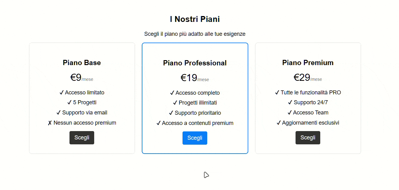 Proseguiamo aggiungendo un breve JavaScript opzionale per migliorare l'interattività della pricing table. In questo esempio, evidenzieremo il piano selezionato cliccando sul pulsante "Scegli", così da renderlo più dinamico per l’utente.