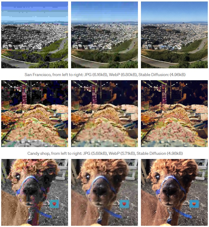 Stando ai risultati ottenuti, un'immagine dal peso originale pari a 768KB sarebbe stata compressa fino a 5.66KB utilizzando il formato JPEG, fino a 6.74KB con WebP e fino a 4.97KB con Stable Diffusion.