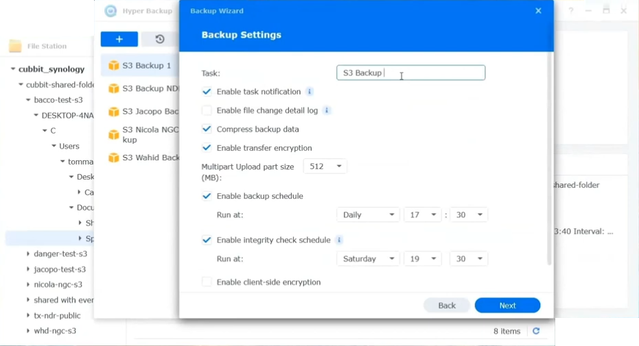 Una volta concluso questo passaggio non dobbiamo fare altro che accedere al NAS per configurare un nuovo task di backup da rendere compatibile con lo storage S3 e puntarlo verso Cubbit. La console permette così di creare un'access key e una secret key per l'autenticazione al servizio remoto. Possiamo quindi selezionare il bucket di Backup definito in precedenza e il sistema crea automaticamente un directory di destinazione per la copia di sicurezza.