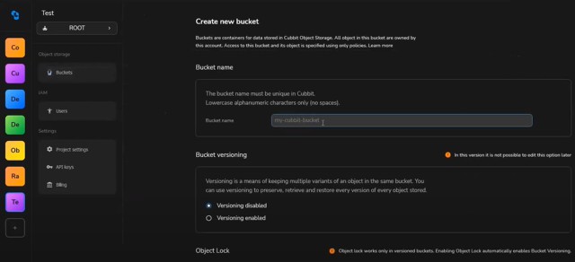 Si pensi ad esempio al caso in cui un client di Synology venga utilizzato per sincronizzare in tempo reale uno spazio di lavoro nel quale sono contenuti documenti o altri file. Volendo salvare lo stato corrente del nostro NAS è possibile innanzitutto accedere direttamente online alla console di Cubbit per la creazione di un bucket, al quale attribuire un nome univoco, e abilitare eventualmente il versionamento o l'Object Lock.