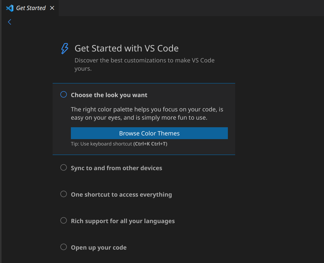 Le altre opzioni permettono di accedere alla command palette, le estensioni e le altre sezioni del software.