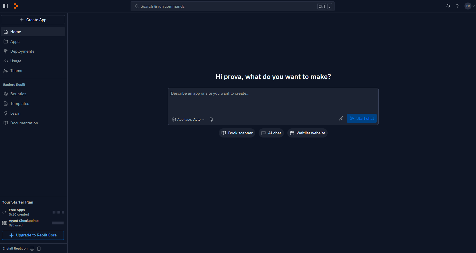 La dashboard di Replit rappresenta il punto di partenza per tutte le attività di sviluppo all’interno della piattaforma. Una volta effettuato l’accesso, ci troviamo di fronte a un’interfaccia semplice ma ricca di funzionalità. Al centro della schermata principale troviamo una sezione che ci invita a descrivere, anche in linguaggio naturale, l'applicazione che desideriamo creare. Possiamo scrivere, ad esempio, “voglio realizzare un sito per la prenotazione di eventi” e avviare un processo guidato con l’ausilio dell’intelligenza artificiale, semplicemente cliccando su “Start chat”.