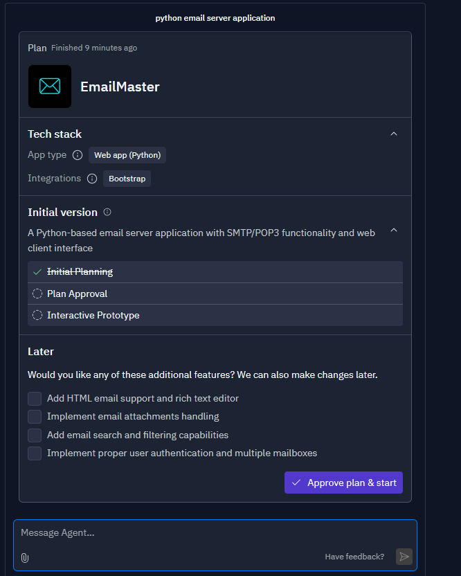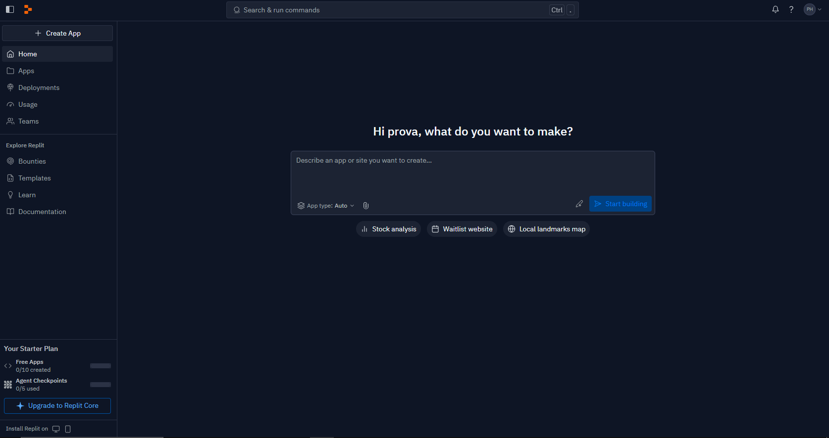 Creare un progetto, è molto semplice: bisogna, se ci troviamo nella dashboard principale, scrivere come prompt il software che vorremmo generare e premere "Start Building". Come esempio proviamo a creare un server di posta elettronica. Quindi scriviamo: "Creami un server di posta elettronica". Replt impiegherà un pò di tempo (certamente questo dipende dalla natura del progetto che richiederemo) per poi mostrarvi un ulteriore schermata in cui vi chiederà ulteriori informazioni inerenti, chiaramente, il progetto da creare.