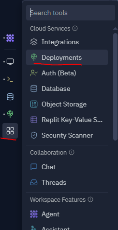 Dalla workspace del nostro progetto, clicchiamo sull’icona "Deployments" nel menu in basso a sinistra, come mostrato in figura: