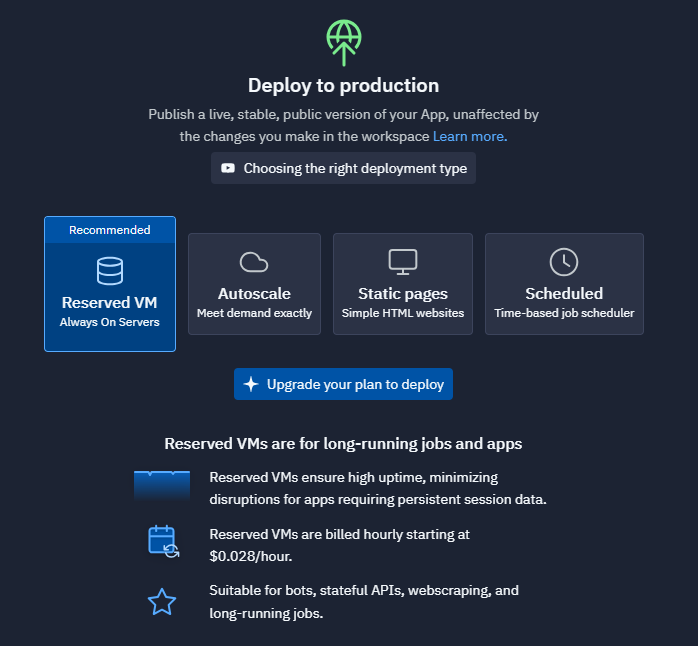 - Reserved VM Deployments: il nostro progetto viene eseguito su una macchina virtuale dedicata, il che garantisce prestazioni costanti e disponibilità continua. È la soluzione che scegliamo per bot, API, app web complesse o qualsiasi servizio che deve restare sempre attivo (come un bot Discord o una REST API personalizzata).