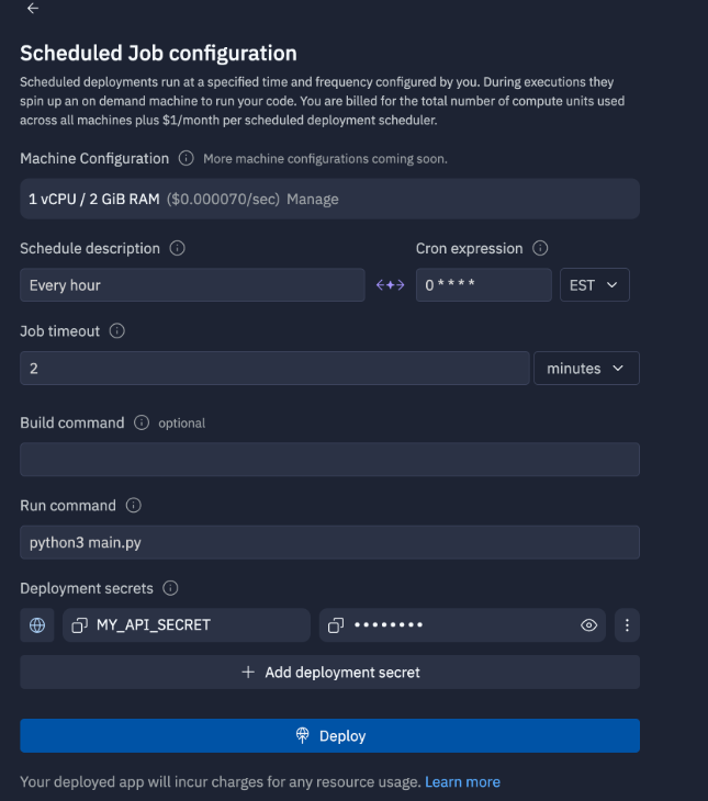 Non sono invece adatti per applicazioni continue o a lungo termine, come ad esempio i siti web. Possiamo accedere alla sezione dedicata ai deployments programmati attraverso lo strumento Deployments nella nostra workspace. Abbiamo a disposizione un campo che ci mostra l’utilizzo stimato della CPU, della RAM e il costo associato al deployment schedulato.