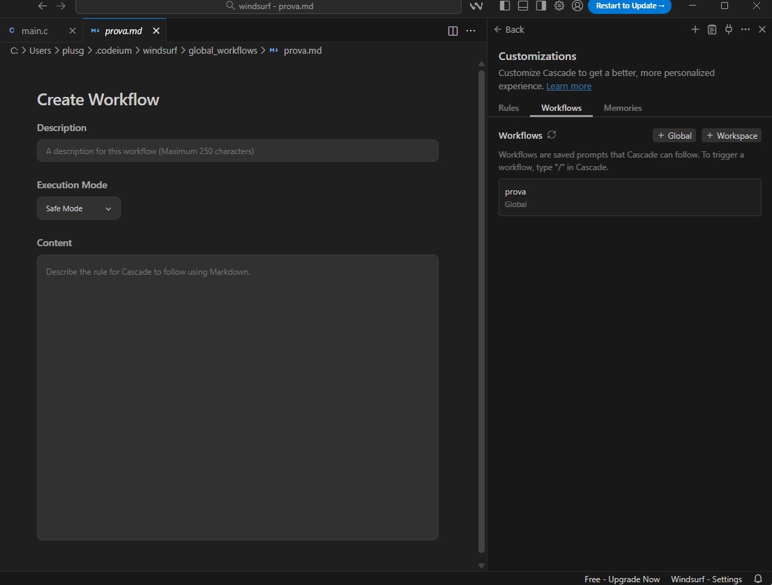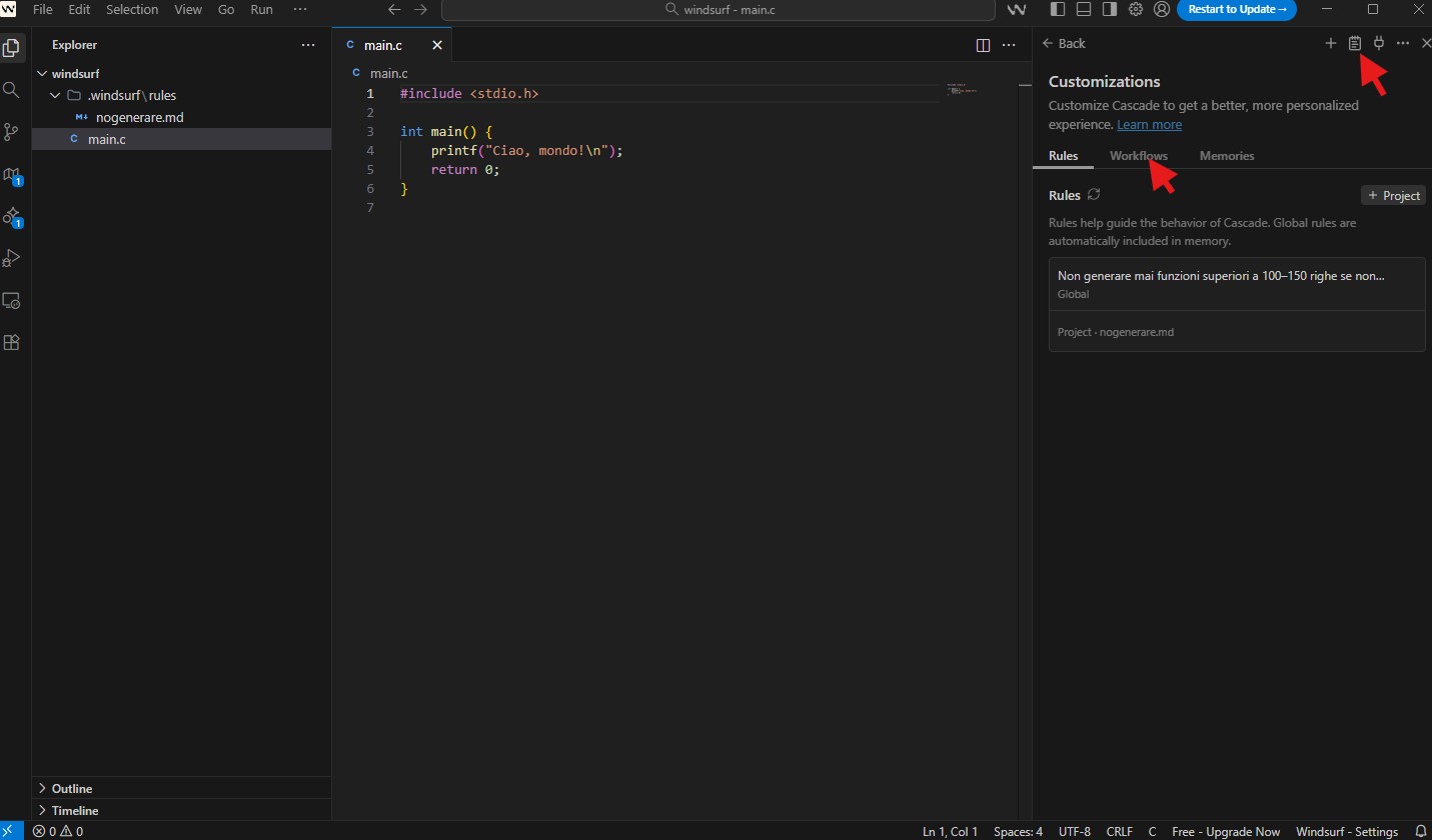 Una volta completato il contenuto del Workflow, salviamo il file nella directory corretta (se il workflow si trova in una delle cartelle riconosciute da Windsurf, Cascade lo individua automaticamente senza bisogno di ulteriori configurazioni). A questo punto possiamo testarlo immediatamente invocandolo con un semplice comando slash, come /nome-workflow, verificando che ogni passaggio venga eseguito correttamente e apportando eventuali correzioni prima di adottarlo stabilmente nel nostro processo di lavoro.