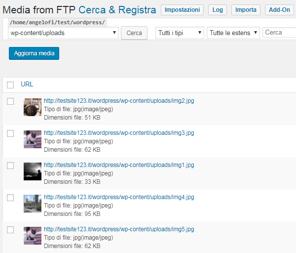 Un esempio di file caricati via FTP e rilevati dal plugin.